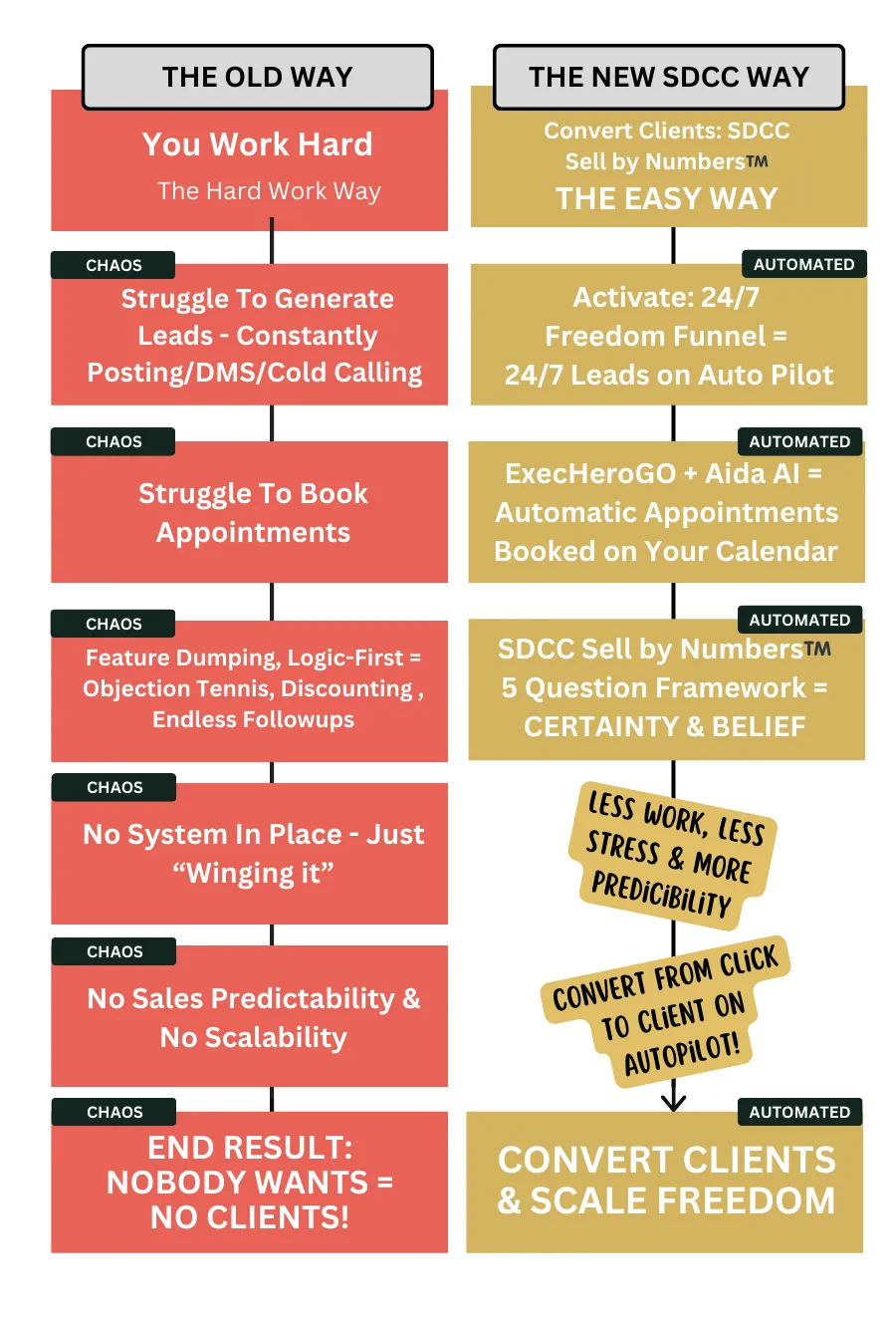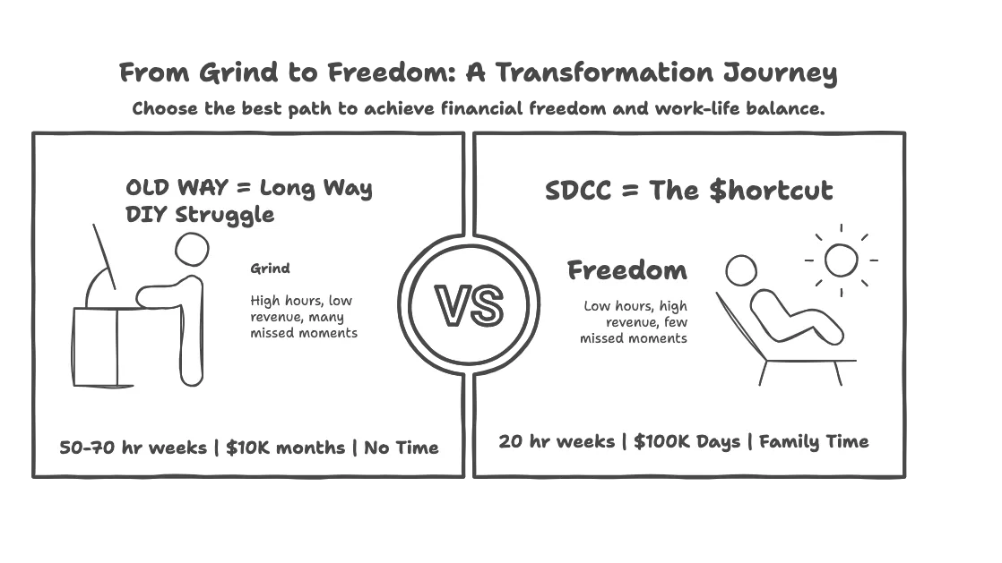 In one picture: the hard way vs. the SDCC Mind-First Way—that installs in minutes and closes high-ticket in hours.